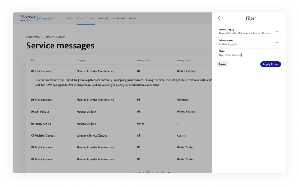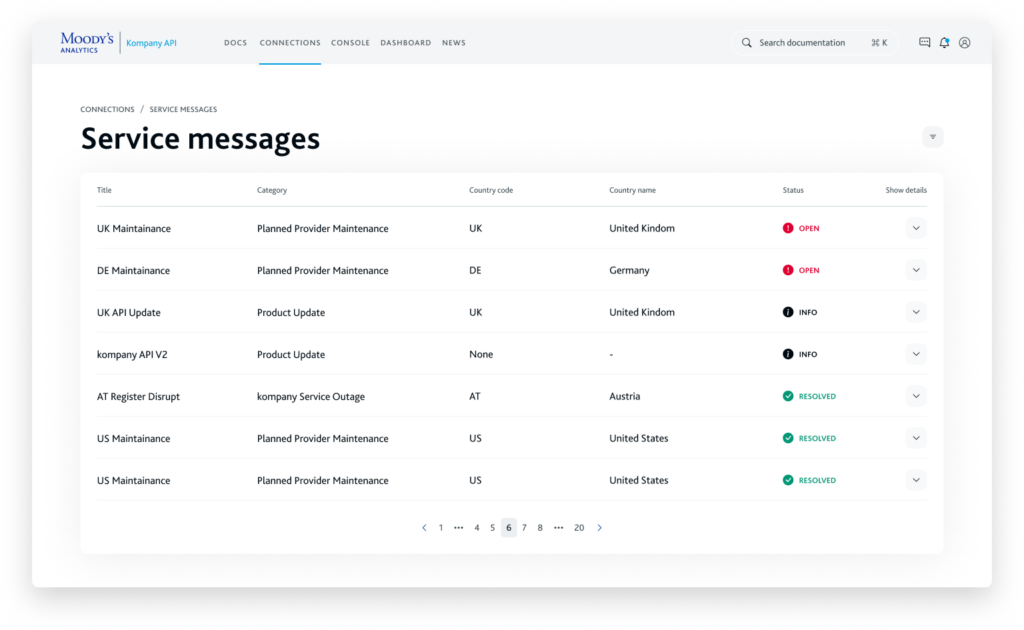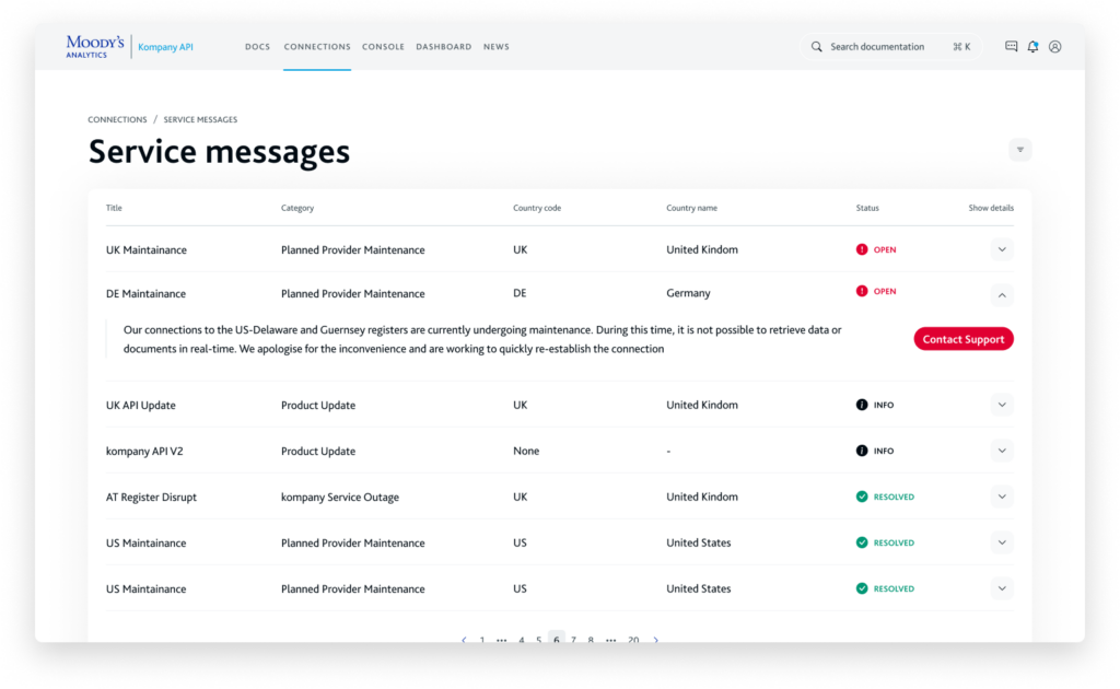 Message list – This includes the Title, Category, Country Code, and a short description of the Country represented. Additionally, it indicates the jurisdictions affected. The status indicates whether the message is still OPEN or has already been CLOSED. For product/feature updates, we use the status INFO.